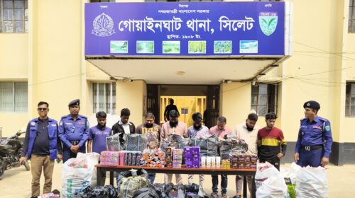 সিলেটের গোয়াইনঘাটে বিপুল পরিমান ভারতীয় কসমেটিকস পণ্যসহ আটজনকে আটক করেছে গোয়াইনঘাট থানা পুলিশ। পুলিশ সূত্রে জানা যায়, বুধবার (১১ মার্চ) সকালে উপজেলা সদরের ব্রীজের পাশে গোয়াইনঘাট থানার এসআই মোঃ মোজাম্মেল হক'র নেতৃত্বে অভিযান পরিচালনা করার…