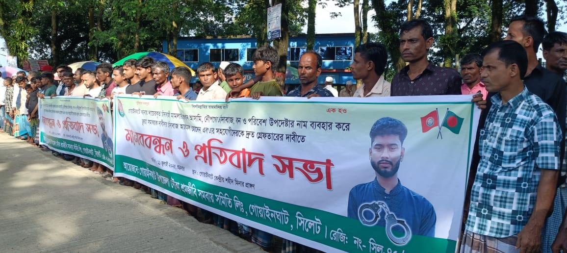 সংগঠনের সভাপতি আলিম উদ্দিনের সভাপতিত্বে ও ইউপি সদস্য ও যুবদল নেতা কামাল উদ্দিনের পরিচালনায় মানববন্ধন ও প্রতিবাদ সভায় বক্তারা বলেন, আওয়ামী ফ্যাসিবাদ সরকারের পতনের পর থেকে আওয়ামী পরিবারের সদস্য গোয়াইনঘাটের লেঙ্গুরা গ্রামের আজমল হোসেন নিজেকে বৈষম্য বিরোধী ছাত্র আন্দোলনের সমন্বয়ক পরিচয় দিয়ে গোয়াইনঘাটের বিভিন্ন জায়গা থেকে চাঁদাবাজি করে আসছে। আজমল গ্রুপকে চাঁদা না দিলেই সোশ্যাল মিডিয়ার মাধ্যমে মানহানিকর বক্তব্য প্রদান করে। সম্প্রতি আজমল গংরা লেংগুরা গ্রামের পাশে নদীতে কয়েক শতাধিক নৌকা, বলগেট আটকিয়ে চাঁদা দাবি করে। নৌ শ্রমিকরা চাঁদা দিতে অস্বীকার করায় আজমল ও তার গ্রুপের সদস্যরা দীর্ঘ ১০ দিন নৌকাগুলো তাদের নিয়ন্ত্রণে আটক করে রাখে। পরে খবর পেয়ে যৌথ বাহিনী অভিযান পরিচালনা করে নৌকাগুলো চাঁদাবাজদের কাছ থেকে উদ্ধার করে।